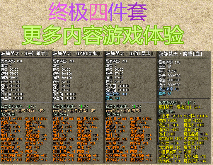 【装备爆率】:本服精心为散人玩家设计.所有小怪均可以爆出初级装备.5W血量上的BOSS教主爆出秒杀一切套装!!