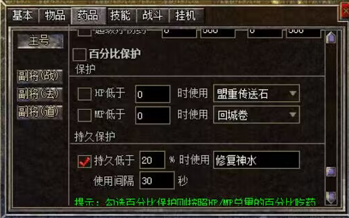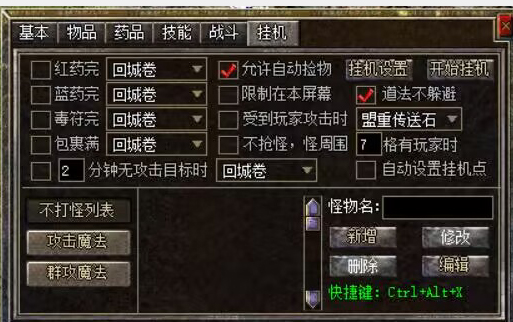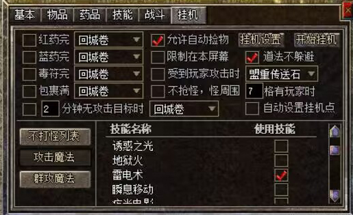 【攻击魔法】: 单体攻击技能设置,法道需要选择挂机技能,否则将会是近身砍怪,而不放技能