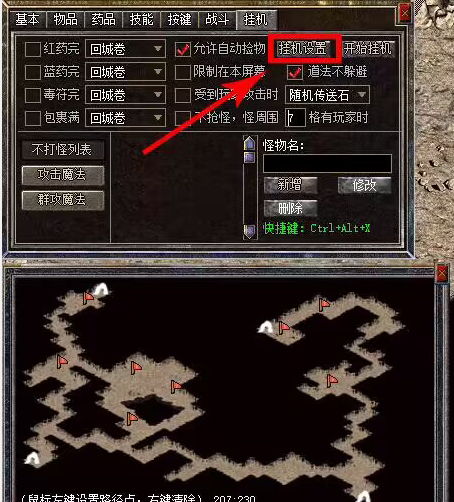 【挂机设置】:需要点开【挂机设置】按钮, 然后用鼠标左键点击小地图,加上小红旗!小红旗就是挂机的巡航地点!