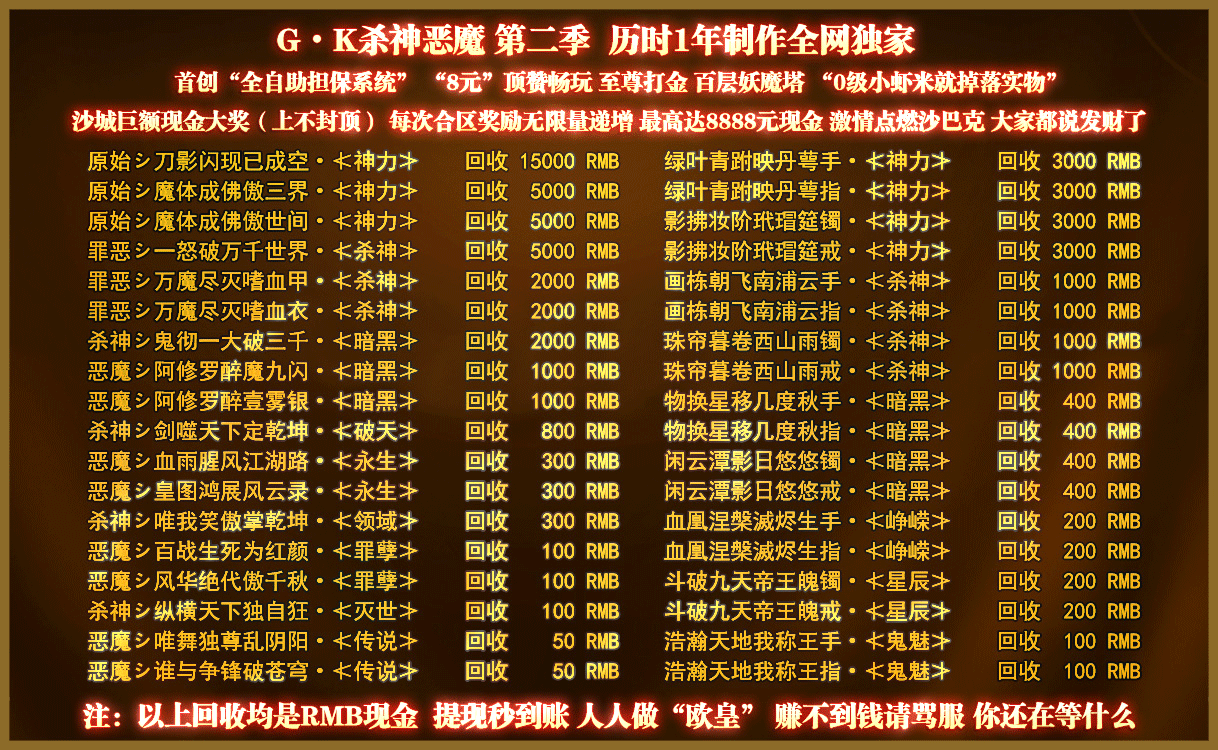 - 2020/01/25【游戏介绍】首爆、首杀、限时、实物、永久回收、我们只多不少!独创[自助担保·与众不同]