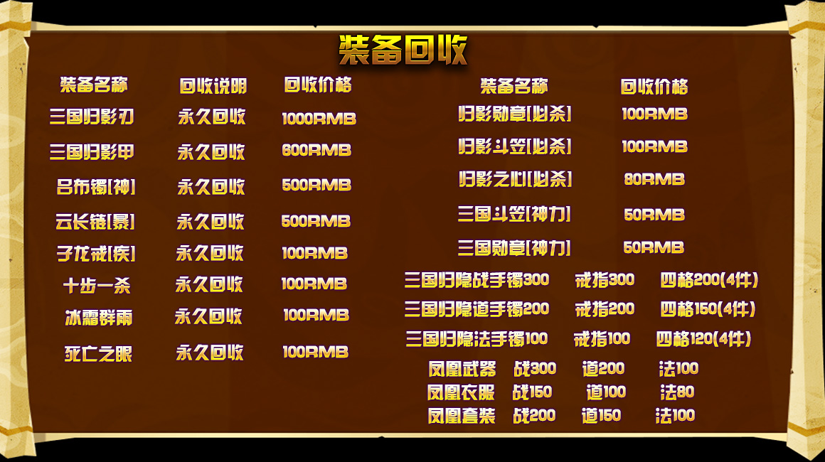 - 【装备介绍】 雷霆→战神→星王→极品→凤凰无双→三国归影→